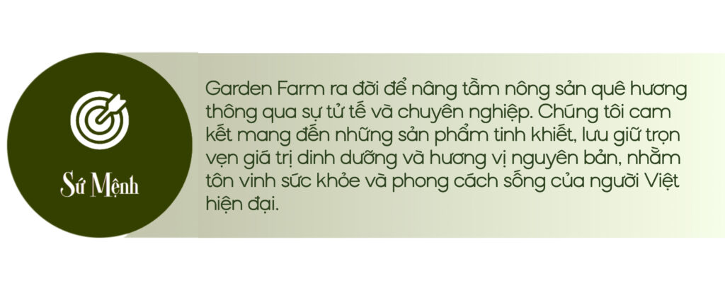 "Tại Garden Farm, giá trị cốt lõi duy nhất chúng tôi theo đuổi là sự Tử tế từ tâm trong việc Tinh tuyển nông sản. Chúng tôi tin rằng, sự sang trọng thực sự không đến từ vẻ hào nhoáng bên ngoài, mà bắt nguồn từ quy trình lựa chọn khắt khe những phẩm cấp thượng hạng nhất của đất mẹ, sự minh bạch tuyệt đối trong chế biến và tư duy thẩm mỹ chuyên nghiệp. Garden Farm không chỉ bán thực phẩm khô; chúng tôi trao gửi sự trân trọng dành cho tinh hoa nông nghiệp quê hương và sức khỏe của người thưởng thức."