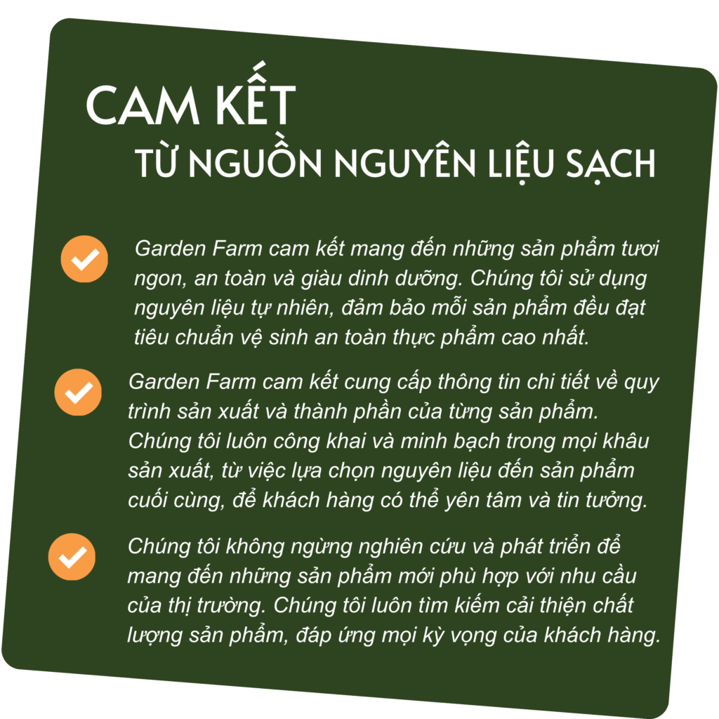 Với sứ mệnh mang đặc sản Việt vươn xa hơn trên hành trình hội nhập, Garden Farm luôn không ngừng nỗ lực hoàn thiện từng sản phẩm – từ chất lượng, quy trình sản xuất đến hình thức đóng gói. Chính khát khao lan tỏa hương vị Việt đến nhiều vùng đất mới đã trở thành động lực thôi thúc chúng tôi phát triển mỗi ngày, từng bước khẳng định vị thế của nông sản và đặc sản Việt trên thị trường trong nước và quốc tế.